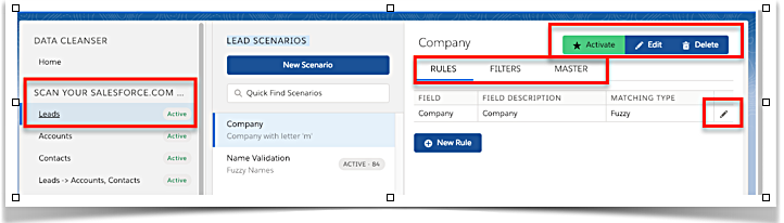 Activation - To activate the scenario and scan your database for duplicates, select your scenario and click on the green 'Activate' button at the top of the screen. To deactivate the scenario, select the scenario and click on the red 'De-Activate' button at the top of the screen. You can also delete a scenario by selecting it and clicking on the blue ' Delete' button at the top of the screen. Please note that when a scenario is activated, the record is updated with a Duplicate Key. The record will then have a new 'Last modified date' of the time the scenario